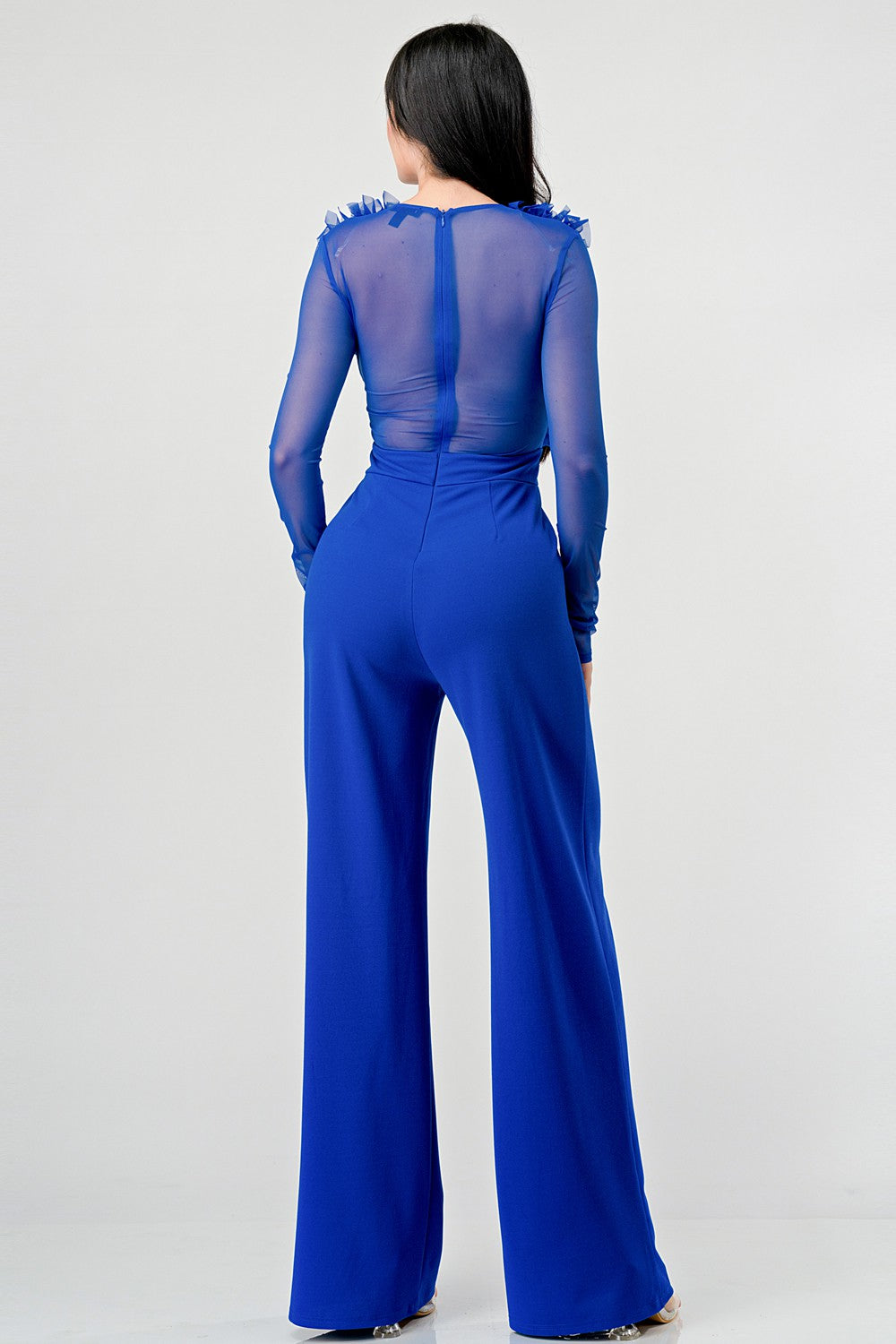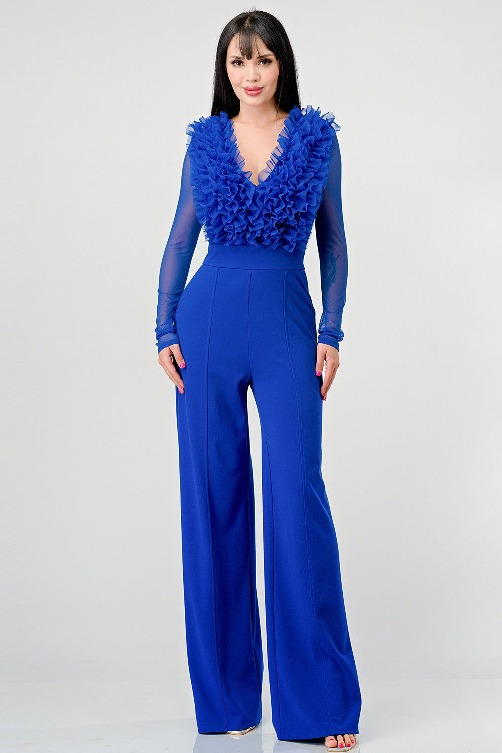 LUXE TECHNO CREPE RUFFLE TRIM V-NECK WIDE LEGS BODYCON JUMPSUIT